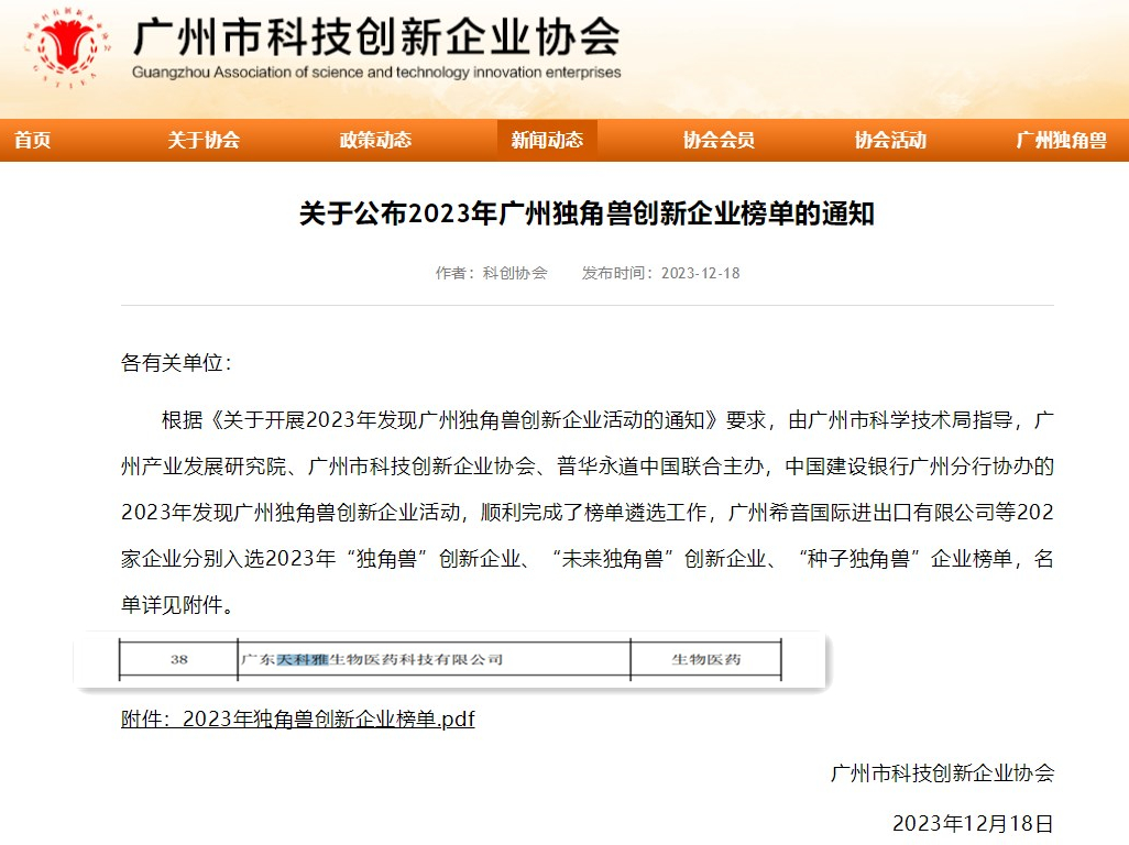 根據(jù)廣州市科技創(chuàng)新企業(yè)協(xié)會網(wǎng)12月18日《關(guān)于公布2023年廣州獨(dú)角獸創(chuàng)新企業(yè)榜單的通知》內(nèi)容所示,天科雅入選2023年“未來獨(dú)角獸”創(chuàng)新企業(yè)榜單。