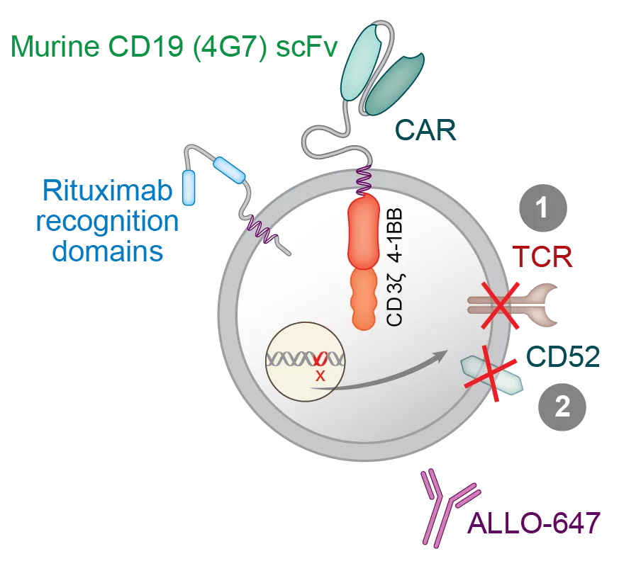 為了減少或杜絕移植物抗宿主?。℅VHD)和異基因排斥風(fēng)險(xiǎn),Allogene會(huì)對(duì)CAR-T細(xì)胞進(jìn)行基因編輯,敲除T細(xì)胞受體基因。此外,Allogene還開(kāi)發(fā)了一款抗CD52單抗ALLO-647用于抑制宿主免疫系統(tǒng),以支持AlloCAR TTM的持續(xù)治療,達(dá)到充分療效。