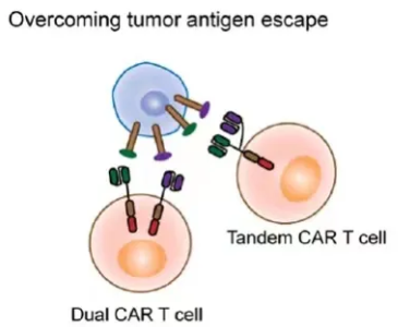 而所謂的多靶點(diǎn)CAR-T細(xì)胞,主要是設(shè)計(jì)用于靶向不同的腫瘤抗原,包括具有兩個(gè)CAR的雙CAR-T細(xì)胞或具有多個(gè)單鏈抗體(scFv)的串聯(lián)CAR-T細(xì)胞。這種多靶點(diǎn)CAR-T, 理論上能夠克服腫瘤抗原異質(zhì)性與腫瘤抗原逃逸
