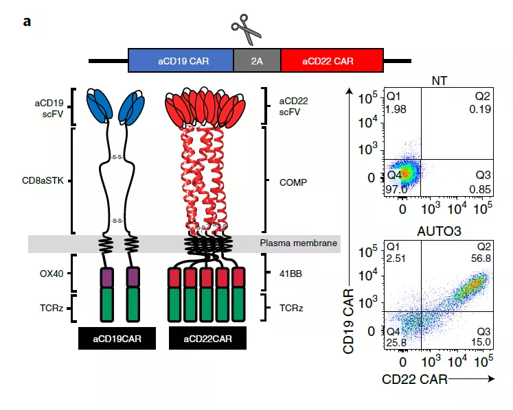 2021年10月12日,Nature Medicine期刊上公布了抗CD19和抗CD22 CAR的自體轉(zhuǎn)導(dǎo)T細(xì)胞(AUTO3)在復(fù)發(fā)性或難治性B-ALL(n=15)的兒童和年輕成年患者中的I期試驗(yàn),以評(píng)估AUTO3的療效。