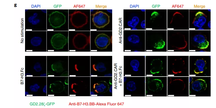 在共聚焦顯微鏡成像顯示CARs在表達(dá)GFP標(biāo)記的GD2.28ζ(綠色)和B7-H3.BB(紅色)的T細(xì)胞中聚集,能夠靶向神經(jīng)母細(xì)胞瘤細(xì)胞,并觀察殺傷效果。在隨后植入了神經(jīng)母細(xì)胞瘤的小鼠上,也驗(yàn)證了雙靶向CAR-T細(xì)胞療法的優(yōu)異抗腫瘤結(jié)果。