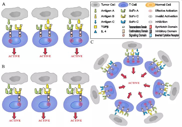 盡管多項(xiàng)研究數(shù)據(jù)顯示,多靶向CAR-T治療多種惡性腫瘤的療效顯示積極,成為預(yù)防抗原逃避的有效手段,但這種類型的CAR-T細(xì)胞可被多個(gè)靶抗原識(shí)別并高強(qiáng)度激活T細(xì)胞,容易引起細(xì)胞因子風(fēng)暴,并對(duì)低表達(dá)靶抗原的正常細(xì)胞過度殺傷。