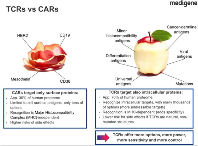 據(jù)雷博士介紹,CAR-T和TCR-T從整體的制備工藝到治療,途徑其實(shí)是一摸一樣的。包括從單采血到病毒載體/非病毒載體的改造,到后續(xù)的擴(kuò)增和回輸。其中最大的區(qū)別在于CAR-T療法所識(shí)別的靶抗原均為細(xì)胞表面蛋白,而胞外抗原僅占總抗原的10%,因此如何尋找適合的靶點(diǎn)成為困難所在。而TCR-T 療法能識(shí)別組織相容性復(fù)合(MHC)分子呈現(xiàn)的細(xì)胞內(nèi)的抗原片段,因此 TCR-T 療法具有更廣泛的靶點(diǎn)。